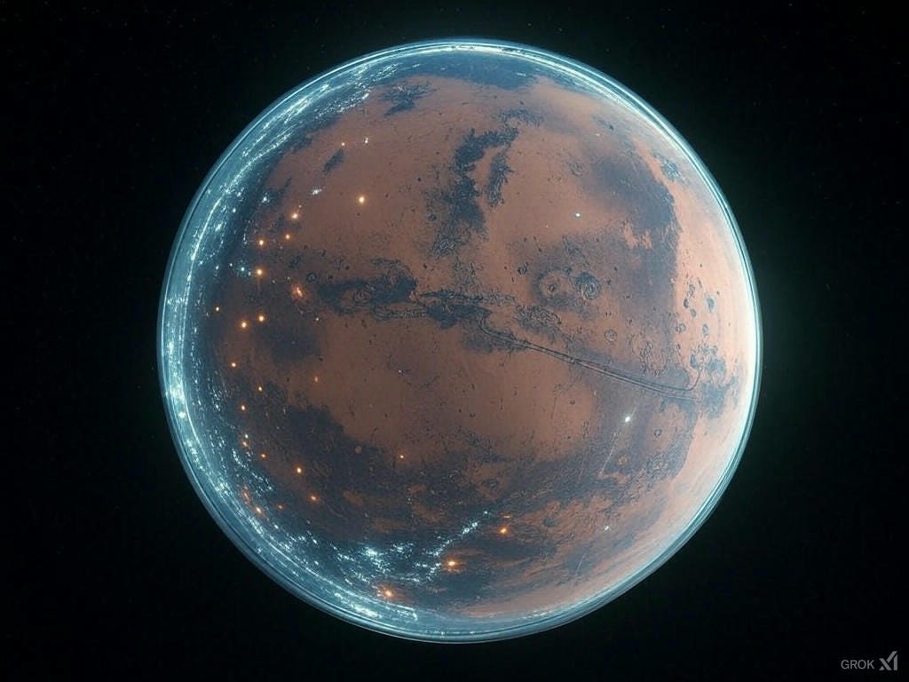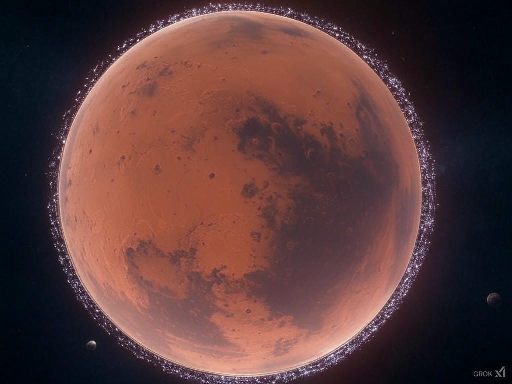 One of Mars’ critical vulnerabilities is its thin atmosphere. A magnetic shield stationed at Mars’ L1 Lagrange point could mitigate solar wind stripping, enabling the gradual buildup of CO2 and other gases. Leveraging SpaceX’s advanced manufacturing capabilities and Starlink’s satellite grid framework, a network of autonomous, AI-enhanced satellites could form the backbone of this shield. These satellites, designed to create a cohesive magnetic field, would operate using xAI’s real-time adaptive algorithms to maintain optimal configurations and counteract solar wind effects. Each satellite would be powered by Tesla’s solar and battery technologies, ensuring resilience and energy efficiency in the harsh Martian environment. The integration of these technologies marks a significant step in creating a sustainable atmospheric shield, paving the way for Mars’ terraforming and eventual habitability.